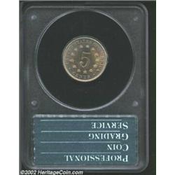 1883 5C MS66 PCGS. The margins have powder-blue patina, while the centers have green-gray color. Bol