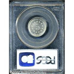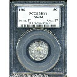 <B>1883<5C> MS66 PCGS.</B></I> This final year Gem has booming luster and a surprisingly sharp strike. A lightly toned and magnificently preserved Shield Nickel that is fit for the highest quality type set. Population: 83 in 66, 8 finer (3/04). <BR><BR><B>Important notice:</B> Heritage usually auctions material at the rate of 200-250 lots per hour. On some occasions eBay Live bid software or the Internet may not be able to keep up with the pace of the auction. We recommend placing a realistic absentee bid now as insurance to avoid disappointment. Occasionally the auctioneer may eliminate or reject an eBay Live bid, and the auctioneer may also reopen a lot after the close of the eBay live bidding (usually because we missed an audience bid), and may reject your bid even if it shows you as the winning bidder. By bidding via eBay Live, you agree that Heritage may award the lot to another bidder at its sole discretion under the circumstances described above or any other reasonable circumstances. Since eBay bids are not shown to us until we open the lot on the floor, we treat those bids just like floor bids. In most cases the floor responds before the eBay bid is presented to us, due to Internet lag time, so for consistency we have made it a policy that floor bids are always considered first over tie eBay live bids. Also please note that all Heritage lots purchased through eBay Live carry a 20% Buyer's Premium. Please make sure you read the Terms and Conditions before you bid.