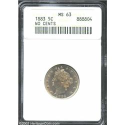 1883 5C No Cents MS63 ANACS. Softly struck on the obverse stars, there is also some striking softnes