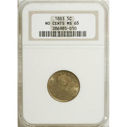 <B>1883 5C No Cents MS65 NGC.</B></I> NGC Census: (1627/448). PCGS Population (1158/332). Mintage: 5,479,519. Numismedia Wsl. Price for NGC/PCGS coin in MS65: $220. (#3841)<BR><BR><B>Coin Engraver:</B> Charles E. Barber<BR><BR><b>Shipping:</b> Coins & Currency (<a target="_blank" href="http://www.heritageauctions.com/common/shipping.php">view shipping information</a>\)