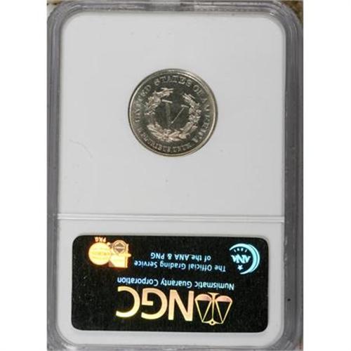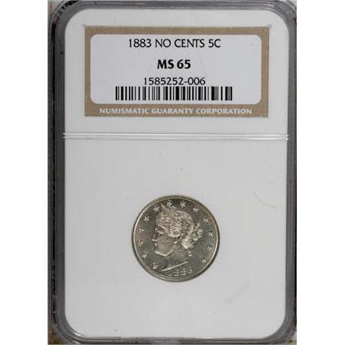 <B>1883 5C No Cents MS65 NGC.</B></I> NGC Census: (1629/451). PCGS Population (1156/331). Mintage: 5,479,519. Numismedia Wsl. Price for NGC/PCGS coin in MS65: $220. (#3841)<BR><BR><B>Coin Engraver:</B> Charles E. Barber<BR><BR><b>Shipping:</b> Coins & Currency (<a target="_blank" href="http://www.heritageauctions.com/common/shipping.php">view shipping information</a>)