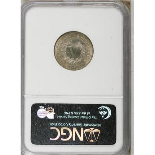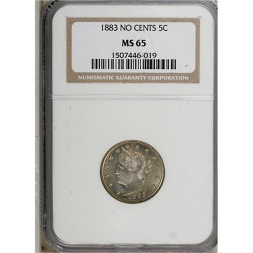 <B>1883 5C No Cents MS65 NGC.</B></I> NGC Census: (1653/453). PCGS Population (1174/345). Mintage: 5,479,519. Numismedia Wsl. Price for NGC/PCGS coin in MS65: $220. (#3841)<BR><BR><B>Coin Engraver:</B> Charles E. Barber<BR><BR><b>Shipping:</b> Coins & Currency (<a target="_blank" href="http://www.heritageauctions.com/common/shipping.php">view shipping information</a>)