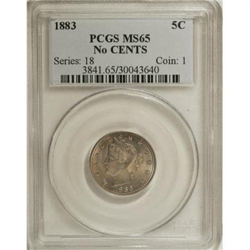 <B>1883 5C No Cents MS65 PCGS.</B></I> PCGS Population (1168/330). NGC Census: (1612/444). Mintage: 5,479,519. Numismedia Wsl. Price for NGC/PCGS coin in MS65: $216. (#3841)<BR><BR><b>Shipping:</b> Coins & Currency (<a target="_blank" href="http://www.heritageauctions.com/common/shipping.php">view shipping information</a>)