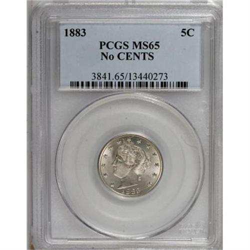 <B>1883 5C No Cents MS65 PCGS.</B></I> PCGS Population (1160/334). NGC Census: (1633/451). Mintage: 5,479,519. Numismedia Wsl. Price for NGC/PCGS coin in MS65: $220. (#3841)<BR><BR><B>Coin Engraver:</B> Charles E. Barber<BR><BR><b>Shipping:</b> Coins & Currency (<a target="_blank" href="http://www.heritageauctions.com/common/shipping.php">view shipping information</a>)