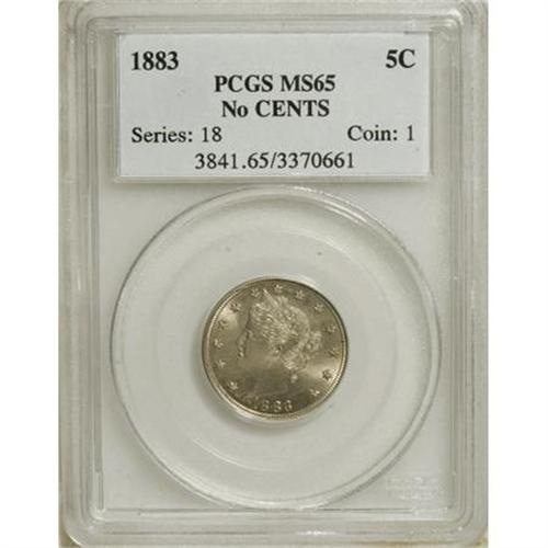 <B>1883 5C No Cents MS65 PCGS.</B></I> PCGS Population (1199/349). NGC Census: (1668/462). Mintage: 5,479,519. Numismedia Wsl. Price for NGC/PCGS coin in MS65: $215. (#3841)<BR><BR><B>Coin Engraver:</B> Charles E. Barber<BR><BR><b>Shipping:</b> Coins & Currency (<a target="_blank" href="http://www.heritageauctions.com/common/shipping.php">view shipping information</a>)