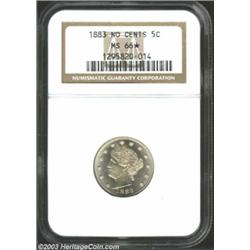 1883 5C No Cents MS66 * NGC. A flashy and semi-prooflike Gem with a seemingly unimprovable strike and well preserved surfaces. The obverse border has spindly die cracks, as made. Light honey-gold color adds to the charm of this beautiful type coin. Important notice: We expect to be auctioning lots at the rate of 200-250 per hour. On occasion eBay live bid software cannot keep up with the pace of the auctions where 4-5 lots per minute can hammer down, so we recommend that you place a realistic absentee bid now as insurance to avoid disappointment. Also please note that all Heritage/CAA lots purchased through eBay Live carry a 20% Buyer's Premium. Please make sure you read the Terms and Conditions.