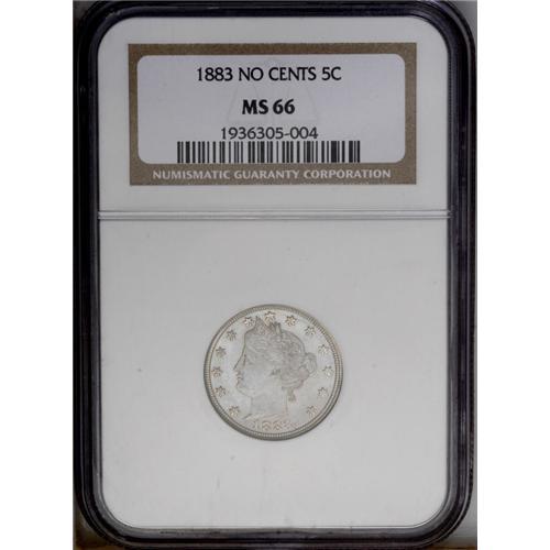 <B>1883<5C> No Cents MS66 NGC.</B></I> Pastel sky-blue and salmon-pink luster bathes this magnificently preserved and reasonably struck Premium Gem. Technically a common date, but popular as a storied and short-lived type. <BR><BR><B>Important notice:</B> Heritage usually auctions material at the rate of 200-250 lots per hour. On some occasions eBay Live bid software or the Internet may not be able to keep up with the pace of the auction. We recommend placing a realistic absentee bid now as insurance to avoid disappointment. Occasionally the auctioneer may eliminate or reject an eBay Live bid, and the auctioneer may also reopen a lot after the close of the eBay live bidding (usually because we missed an audience bid), and may reject your bid even if it shows you as the winning bidder. By bidding via eBay Live, you agree that Heritage may award the lot to another bidder at its sole discretion under the circumstances described above or any other reasonable circumstances. Since eBay bids are not shown to us until we open the lot on the floor, we treat those bids just like floor bids. In most cases the floor responds before the eBay bid is presented to us, due to Internet lag time, so for consistency we have made it a policy that floor bids are always considered first over tie eBay live bids. Also please note that all Heritage lots purchased through eBay Live carry a 20% Buyer's Premium. Please make sure you read the Terms and Conditions before you bid. This lot is being auctioned in conjunction with a live floor auction by Heritage Galleries & Auctioneers. All final auction and invoice information will be supplied by Heritage Galleries & Auctioneers, and all other information should be considered preliminary. Lot:906 <BR><BR><B>Winning Notification and Billing:</B> After the FINAL session in this auction is complete, Heritage will send e-mail and snail mail invoices. This process normally takes several days. All final auction and invoice information will be supplied by Heritage Galleries & Auctioneers, and all other information should be considered preliminary. <BR><BR>This auction will be conducted on a live auction floor and over the Internet through eBay Live. If you choose to place an absentee bid, please take a moment to <font color='#0000ff'><u><a href='http://pages.ebay.com/liveauctions/help/before/laabsentee.html'>learn how eBay Live absentee bidding works</a></u></font><font color='#000000'>