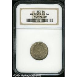 1883 5C No Cents MS66 NGC. The design elements are <B>1883 5C No Cents MS66 NGC.</B></I> The design elements are well struck throughout, and the lustrous surfaces reveal a thin layer of olive-gold color. A couple of tiny marks on Liberty's neck and in the lower right obverse field are noted for accuracy. <BR><BR><B>Important notice:</B> Heritage usually auctions material at the rate of 200-250 lots per hour. On some occasions eBay Live bid software or the Internet may not be able to keep up with the pace of the auction. We recommend placing a realistic absentee bid now as insurance to avoid disappointment. Occasionally the auctioneer may eliminate or reject an eBay Live bid, and the auctioneer may also reopen a lot after the close of the eBay live bidding (usually because we missed an audience bid), and may reject your bid even if it shows you as the winning bidder. By bidding via eBay Live, you agree that Heritage may award the lot to another bidder at its sole discretion under the circumstances described above or any other reasonable circumstances. Since eBay bids are not shown to us until we open the lot on the floor, we treat those bids just like floor bids. In most cases the floor responds before the eBay bid is presented to us, due to Internet lag time, so for consistency we have made it a policy that floor bids are always considered first over tie eBay live bids. Also please note that all Heritage lots purchased through eBay Live carry a 20% Buyer's Premium. Please make sure you read the Terms and Conditions before you bid. This lot is being auctioned in conjunction with a live floor auction by Heritage Galleries & Auctioneers. All final auction and invoice information will be supplied by Heritage Galleries & Auctioneers, and all other information should be considered preliminary. Lot:5520