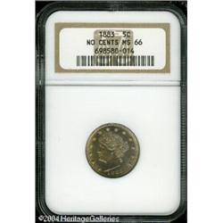 1883 5C No Cents MS66 NGC. Warm olive-gold and pal <B>1883 5C No Cents MS66 NGC.</B></I> Warm olive-gold and pale blue color bathes lustrous surfaces. Well struck, except for some of the star centers, and the leaves to the left of the bow knot. <BR><BR><B>Important notice:</B> Heritage usually auctions material at the rate of 200-250 lots per hour. On some occasions eBay Live bid software or the Internet may not be able to keep up with the pace of the auction. We recommend placing a realistic absentee bid now as insurance to avoid disappointment. Occasionally the auctioneer may eliminate or reject an eBay Live bid, and the auctioneer may also reopen a lot after the close of the eBay live bidding (usually because we missed an audience bid), and may reject your bid even if it shows you as the winning bidder. By bidding via eBay Live, you agree that Heritage may award the lot to another bidder at its sole discretion under the circumstances described above or any other reasonable circumstances. Since eBay bids are not shown to us until we open the lot on the floor, we treat those bids just like floor bids. In most cases the floor responds before the eBay bid is presented to us, due to Internet lag time, so for consistency we have made it a policy that floor bids are always considered first over tie eBay live bids. Also please note that all Heritage lots purchased through eBay Live carry a 20% Buyer's Premium. Please make sure you read the Terms and Conditions before you bid. This lot is being auctioned in conjunction with a live floor auction by Heritage Galleries & Auctioneers. All final auction and invoice information will be supplied by Heritage Galleries & Auctioneers, and all other information should be considered preliminary. Lot:5519