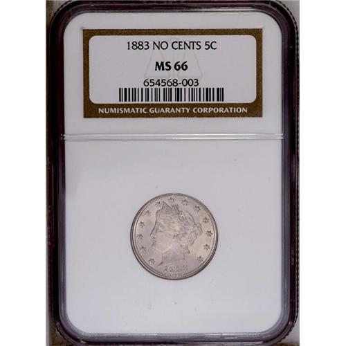 1883 5C No Cents MS66 NGC. Well struck except for the 1883[5C] No Cents MS66 NGC.