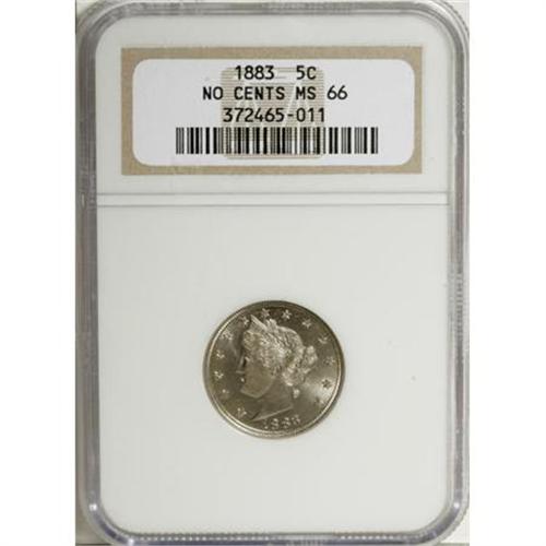 <B>1883 5C No Cents MS66 NGC.</B></I> NGC Census: (410/41). PCGS Population (328/15). Mintage: 5,479,519. Numismedia Wsl. Price for NGC/PCGS coin in MS66: $635. (#3841)<BR><BR><B>Coin Engraver:</B> Charles E. Barber<BR><BR><b>Shipping:</b> Coins & Currency (<a target="_blank" href="http://www.heritageauctions.com/common/shipping.php">view shipping information</a>)