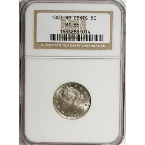 <B>1883 5C No Cents MS66 NGC.</B></I> NGC Census: (410/41). PCGS Population (328/15). Mintage: 5,479,519. Numismedia Wsl. Price for NGC/PCGS coin in MS66: $635. (#3841)<BR><BR><B>Coin Engraver:</B> Charles E. Barber<BR><BR><b>Shipping:</b> Coins & Currency (<a target="_blank" href="http://www.heritageauctions.com/common/shipping.php">view shipping information</a>)