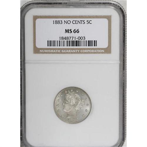 <B>1883 5C No Cents MS66 NGC.</B></I> Barely discernible gold color resides on the highly lustrous surfaces of this wonderful Premium Gem. A couple of light grade-consistent marks do not detract.<BR><BR><B>Coin Engraver:</B> Charles E. Barber<BR><BR><b>Shipping:</b> Coins & Currency (<a target="_blank" href="http://www.heritageauctions.com/common/shipping.php">view shipping information</a>)
