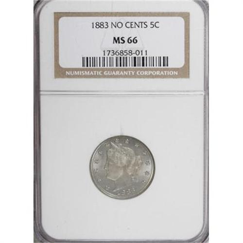 <B>1883 5C No Cents MS66 NGC.</B></I> NGC Census: (417/44). PCGS Population (334/15). Mintage: 5,479,519. Numismedia Wsl. Price for NGC/PCGS coin in MS66: $610. (#3841)<BR><BR><B>Coin Engraver:</B> Charles E. Barber<BR><BR><b>Shipping:</b> Coins & Currency (<a target="_blank" href="http://www.heritageauctions.com/common/shipping.php">view shipping information</a>)
