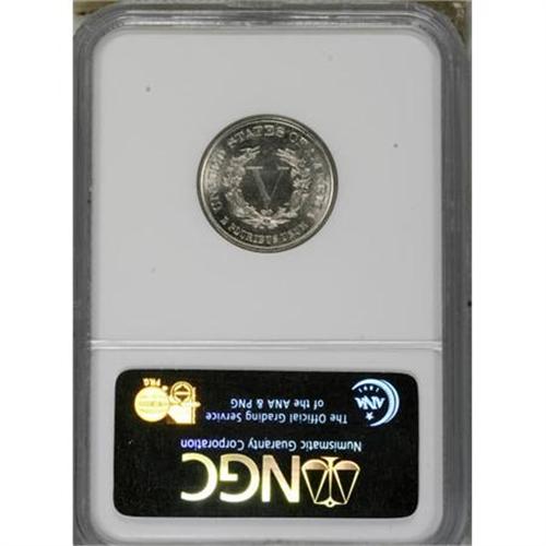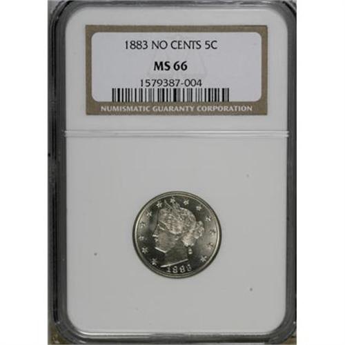 <B>1883 5C No Cents MS66 NGC.</B></I> The portrait offers excellent definition on this essentially untoned coin, though the lower stars show a touch of softness. Overall, a great example of this one-year type.<BR><BR><B>Coin Engraver:</B> Charles E. Barber<BR><BR><b>Shipping:</b> Coins & Currency (<a target="_blank" href="http://www.heritageauctions.com/common/shipping.php">view shipping information</a>)
