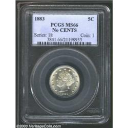 1883 5C No Cents MS66 PCGS. A lustrous Gem with immaculate surfaces and occasional wisps of gold pat