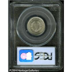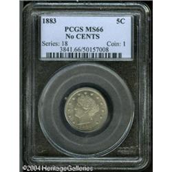 1883 5C No Cents MS66 PCGS. Nickel-gray lustrous s <B>1883 5C No Cents MS66 PCGS.</B></I> Nickel-gray lustrous surfaces display generally well struck motifs, except for softness in some of the star centers, and weak corn and wheat ears and leaves to the left of the bow knot. No abrasions are evident, but a few tiny, light flecks are seen in the lower right obverse quadrant. <BR><BR><B>Important notice:</B> Heritage usually auctions material at the rate of 200-250 lots per hour. On some occasions eBay Live bid software or the Internet may not be able to keep up with the pace of the auction. We recommend placing a realistic absentee bid now as insurance to avoid disappointment. Occasionally the auctioneer may eliminate or reject an eBay Live bid, and the auctioneer may also reopen a lot after the close of the eBay live bidding (usually because we missed an audience bid), and may reject your bid even if it shows you as the winning bidder. By bidding via eBay Live, you agree that Heritage may award the lot to another bidder at its sole discretion under the circumstances described above or any other reasonable circumstances. Since eBay bids are not shown to us until we open the lot on the floor, we treat those bids just like floor bids. In most cases the floor responds before the eBay bid is presented to us, due to Internet lag time, so for consistency we have made it a policy that floor bids are always considered first over tie eBay live bids. Also please note that all Heritage lots purchased through eBay Live carry a 20% Buyer's Premium. Please make sure you read the Terms and Conditions before you bid. This lot is being auctioned in conjunction with a live floor auction by Heritage Galleries & Auctioneers. All final auction and invoice information will be supplied by Heritage Galleries & Auctioneers, and all other information should be considered preliminary. Lot:5518