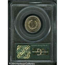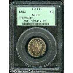 1883 5C No Cents MS66 PCGS. Speckled olive-gray to <B>1883 5C No Cents MS66 PCGS.</B></I> Speckled olive-gray toning over lustrous surfaces. Well struck, save for the corn and wheat ears to the left of the bow knot. <BR><BR><B>Important notice:</B> Heritage usually auctions material at the rate of 200-250 lots per hour. On some occasions eBay Live bid software or the Internet may not be able to keep up with the pace of the auction. We recommend placing a realistic absentee bid now as insurance to avoid disappointment. Occasionally the auctioneer may eliminate or reject an eBay Live bid, and the auctioneer may also reopen a lot after the close of the eBay live bidding (usually because we missed an audience bid), and may reject your bid even if it shows you as the winning bidder. By bidding via eBay Live, you agree that Heritage may award the lot to another bidder at its sole discretion under the circumstances described above or any other reasonable circumstances. Since eBay bids are not shown to us until we open the lot on the floor, we treat those bids just like floor bids. In most cases the floor responds before the eBay bid is presented to us, due to Internet lag time, so for consistency we have made it a policy that floor bids are always considered first over tie eBay live bids. Also please note that all Heritage lots purchased through eBay Live carry a 20% Buyer's Premium. Please make sure you read the Terms and Conditions before you bid. This lot is being auctioned in conjunction with a live floor auction by Heritage Galleries & Auctioneers. All final auction and invoice information will be supplied by Heritage Galleries & Auctioneers, and all other information should be considered preliminary. Lot:5517