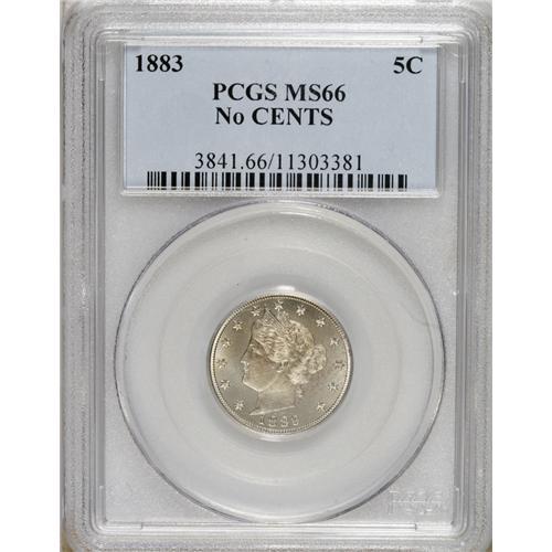 <B>1883 5C No Cents MS66 PCGS.</B></I> The delicate chestnut-brown shades are slightly more apparent on the obverse. This moderately prooflike Premium Gem is sharply struck on the portrait, while the wreath is only indistinct on the left ear of corn.<BR><BR><b>Shipping:</b> Coins & Currency (<a target="_blank" href="http://www.heritageauctions.com/common/shipping.php">view shipping information</a>)
