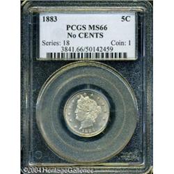 1883 5C No Cents MS66 PCGS. This Premium Gem featu <B>1883 5C No Cents MS66 PCGS.</B></I> This Premium Gem features a very thin veneer of olive-gold color that overlays lustrous surfaces. The design elements are exceptionally well struck throughout, including adequate (though not quite full) definition on the corn kernels and leaves to the left of the bow knot. The only marks occur on the wheat ear to the left of the knot, and on the left upright of the V, but these are trivial and not distracting. A very attractive coin overall. <BR><BR><B>Important notice:</B> Heritage usually auctions material at the rate of 200-250 lots per hour. On some occasions eBay Live bid software or the Internet may not be able to keep up with the pace of the auction. We recommend placing a realistic absentee bid now as insurance to avoid disappointment. Occasionally the auctioneer may eliminate or reject an eBay Live bid, and the auctioneer may also reopen a lot after the close of the eBay live bidding (usually because we missed an audience bid), and may reject your bid even if it shows you as the winning bidder. By bidding via eBay Live, you agree that Heritage may award the lot to another bidder at its sole discretion under the circumstances described above or any other reasonable circumstances. Since eBay bids are not shown to us until we open the lot on the floor, we treat those bids just like floor bids. In most cases the floor responds before the eBay bid is presented to us, due to Internet lag time, so for consistency we have made it a policy that floor bids are always considered first over tie eBay live bids. Also please note that all Heritage lots purchased through eBay Live carry a 20% Buyer's Premium. Please make sure you read the Terms and Conditions before you bid. This lot is being auctioned in conjunction with a live floor auction by Heritage Galleries & Auctioneers. All final auction and invoice information will be supplied by Heritage Galleries & Auctioneers, and all other information should be considered preliminary. Lot:5516