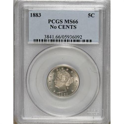 <B>1883 5C No Cents MS66 PCGS.</B></I> As is typical for a new type, the No Cents pieces were saved in considerably greater numbers, although the With Cents pieces had the higher mintage. This No Cents piece offers untoned, attractive, and lightly contrasting surfaces with radiant luster. Light die cracks are seen on each side. PCGS has graded only 15 pieces finer (7/07). <BR><BR><B>Coin Engraver:</B> Charles E. Barber<BR><BR><b>Shipping:</b> Coins & Currency (<a target="_blank" href="http://www.heritageauctions.com/common/shipping.php">view shipping information</a>)