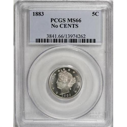 <B>1883 5C No Cents MS66 PCGS.</B></I> A sharply struck and surprisingly flashy example of this popular one-year type issue, exquisitely preserved with a trace of ice-blue patina in the fields. PCGS has graded only 15 finer examples (10/07).<BR><BR><B>Coin Engraver:</B> Charles E. Barber<BR><BR><b>Shipping:</b> Coins & Currency (<a target="_blank" href="http://www.heritageauctions.com/common/shipping.php">view shipping information</a>)