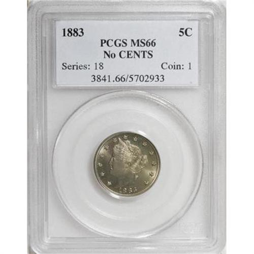 <B>1883 5C No Cents MS66 PCGS.</B></I> Soft gold and powder-blue patina covers the obverse of this No Cents issue, while warm beige-gold and violet occupy the reverse. A powerful strike leaves virtually complete definition on the design elements, and impeccably preserved surfaces possess glowing luster.<BR><BR><B>Coin Engraver:</B> Charles E. Barber<BR><BR><b>Shipping:</b> Coins & Currency (<a target="_blank" href="http://www.heritageauctions.com/common/shipping.php">view shipping information</a>)