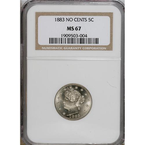 <B>1883 5C No Cents MS67 NGC.</B></I> An attractive example of this one-year type coin, essentially untoned with bold detail and strong luster. A few spidery die cracks link the stars.<BR><BR><b>Shipping:</b> Coins & Currency (<a target="_blank" href="http://www.heritageauctions.com/common/shipping.php">view shipping information</a>)