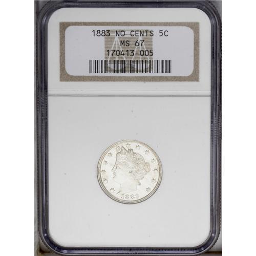 <B>1883<5C> No Cents MS67 NGC.</B></I> Superior mint luster characterizes this bright, sparkling Superb Gem. Mostly brilliant. An exceptionally attractive example of this one-year type.