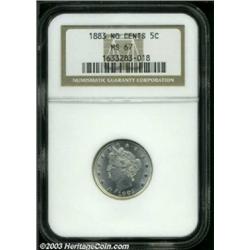 <table><tr><td><TABLE cellSpacing=0 cellPadding=0 width="100%" bgColor=#000000 border=0><TBODY> <TR><TD width="100%"><TABLE cellSpacing=1 cellPadding=3 width="100%" border=0><TBODY><TR><TD width="100%" bgColor=#79735c><FONT face=arial color=#ffffff size=3><B>Description</B> </FONT></TD></TR><TR><TD width="100%" bgColor=#ffffff><FONT face=arial size=2><B>1883 5C No Cents MS67 NGC.</B></I> Highly lustrous and clean, but exhibiting some of the typical softness on several of the stars and the left ear of corn in the wreath. Brilliant with gleaming, satiny fields that exhibit slender diagonal die polish lines, as struck, on each side. A flashy Superb Gem, with excellent eye appeal. None have thus far been graded finer at either service. Population: 28 in 67, 0 finer (7/03). </FONT></TD></TR></TBODY></TABLE></TD></TR></TBODY></TABLE><BR><A name=PricesRealized></A><TABLE cellSpacing=0 cellPadding=0 width="100%" bgColor=#000000 border=0><TBODY><TR><TD width="100%"><TABLE cellSpacing=1 cellPadding=3 width="100%" border=0><TBODY><TR><TD width="100%" bgColor=#79735c><A name=PR><FONT face=arial color=#ffffff size=3><B>Previous Prices from Heritage Auctions</B> </FONT></A></TD></TR><TR><TD bgColor=#f6f6ed><TABLE cellSpacing=0 cellPadding=0 width="100%" border=1><TBODY><TR><TD align=middle width="33%"><B>Date</B></TD><TD align=middle width="33%"><B>Service</B></TD><TD align=middle width="33%"><B>Price</B></TD></TR><TR bgColor=whitesmoke><TD width="33%"><B>06/17/2003</B></TD><TD width="33%">NGC</TD><TD width="33%">$2,415.00</TD></TR><TR bgColor=whitesmoke><TD width="33%"><B>08/06/2002</B></TD><TD width="33%">NGC</TD><TD width="33%">$2,300.00</TD></TR><TR bgColor=whitesmoke><TD width="33%"><B>09/25/2001</B></TD><TD width="33%">NGC</TD><TD width="33%">$1,650.00</TD></TR><TR bgColor=whitesmoke><TD width="33%"><B>09/20/2003</B></TD><TD width="33%">PCGS</TD><TD width="33%">$3,565.00</TD></TR><TR bgColor=whitesmoke><TD width="33%"><B>05/03/2003</B></TD><TD width="33%">NGC</TD><TD width="33%">$1,851.50</TD></TR><TR bgColor=whitesmoke><TD width="33%"><B>01/11/2003</B></TD><TD width="33%">PCGS</TD><TD width="33%">$3,565.00</TD></TR><TR bgColor=whitesmoke><TD width="33%"><B>01/11/2003</B></TD><TD width="33%">NGC</TD><TD width="33%">$1,955.00</TD></TR><TR bgColor=whitesmoke><TD width="33%"><B>11/23/2002</B></TD><TD width="33%">PCGS</TD><TD width="33%">$3,910.00</TD></TR><TR bgColor=whitesmoke><TD width="33%"><B>08/13/1999</B></TD><TD width="33%">NGC</TD><TD width="33%">$1,782.50</TD></TR><TR bgColor=whitesmoke><TD width="33%"><B>09/26/1998</B></TD><TD width="33%">NGC</TD><TD width="33%">$2,070.00</TD></TR><TR bgColor=whitesmoke><TD width="33%"><B>03/21/1998</B></TD><TD width="33%">NGC</TD><TD width="33%">$1,725.00</TD></TR><TR bgColor=whitesmoke><TD width="33%"><B>01/06/1996</B></TD><TD width="33%">PCGS</TD><TD width="33%">$1,485.00</TD></TR><TR bgColor=whitesmoke><TD width="33%"><B>07/30/1994</B></TD><TD width="33%">PCGS</TD><TD width="33%">$2,805.00</TD></TR><TR bgColor=whitesmoke><TD width="33%"><B>08/01/1998</B></TD><TD width="33%">PCGS</TD><TD width="33%">$2,990.00</TD></TR></TBODY></TABLE></TD></TR><TR><TD bgColor=#ffffff><FONT face=arial size=1 ?>PLEASE NOTE: All prices realized reflect the final hammer price PLUS the buyer's premium in auctions that charge a buyer's premium. Each item has a notation at the top of the listing indicating whether that lot included a buyer's premium. Example: A item that sells with a final hammer price of $100 and a 20% buyer's premium will display with a price realized of $120. All information listed is intended to be as accurate as possible, but errors are possible. Please use this guide carefully and inform us of any inaccuracies. </FONT></TD></TR></TBODY></TABLE></TD></TR></TBODY></TABLE><BR><TABLE cellSpacing=0 cellPadding=0 width="100%" bgColor=#000000 border=0><TBODY><TR><TD width="100%"><TABLE cellSpacing=1 cellPadding=3 width="100%" border=0><TBODY><TR><TD width="100%" bgColor=#79735c colSpan=6><FONT face=arial color=#ffffff size=3><B>Price Guide*</B> </FONT></TD></TR><TR bgColor=#f6f6ed><TD align=middle><B>Grade</B> </TD><TD align=middle><B>Coin World<BR>(Trends)</B> </TD><TD align=middle><B>Numismedia<BR>Retail</B> </TD><TD align=middle><B>Numismedia<BR>Wholesale</B> </TD><TD align=middle><B>Coin<BR>Universe</B> </TD><TD align=middle><B>Heritage<BR>Value Index</B> </TD></TR><TR bgColor=#ffffff><TD align=middle>66</TD><TD align=right>---</TD><TD align=right>$750.00</TD><TD align=right>$600.00</TD><TD align=right>$950.00</TD><TD align=right>$595.00</TD></TR><TR style="FONT-WEIGHT: bold" bgColor=#cccfdd><TD align=middle>67</TD><TD align=right>---</TD><TD align=right>---</TD><TD align=right>$2,650.00</TD><TD align=right>$4,650.00</TD><TD align=right>$3,410.00</TD></TR><TR bgColor=#ffffff><TD align=middle>68</TD><TD align=right>---</TD><TD align=right>---</TD><TD align=right>---</TD><TD align=right>---</TD><TD align=right>---</TD></TR><TR bgColor=#ffffff><TD colSpan=6><FONT size=1>*All information listed is intended to be as accurate as possible, but errors are possible. No item may be returned or refused based on this information which is provided as a service to our customers. You should contact each pricing source directly to determine the accuracy of this information. </FONT></TD></TR></TBODY></TABLE></TD></TR></TBODY></TABLE><BR><TABLE cellSpacing=0 cellPadding=0 width="100%" bgColor=#000000 border=0><TBODY><TR><TD width="100%"><TABLE cellSpacing=1 cellPadding=3 width="100%" border=0><TBODY><TR><TD width="100%" bgColor=#79735c><FONT face=arial color=#ffffff size=3><B>Population Guide</B> </FONT></TD></TR><TR bgColor=#ffffff><TD align=middle><!-- Begin Output of Population Grid--><TABLE cellSpacing=0 cellPadding=0 width="100%" border=0><TBODY><TR><TD vAlign=center><TABLE cellSpacing=0 width="100%" border=1 cellsadding="3"><TBODY><TR><TD vAlign=center><TABLE cellSpacing=0 cellPadding=3 width="100%" border=1><TBODY><TR><TD vAlign=center align=middle bgColor=#f0f1e8 co