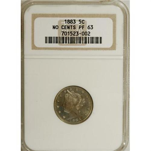 <B>1883 5C No Cents PR63 NGC.</B></I> NGC Census: (53/600). PCGS Population (131/712). Mintage: 5,219. Numismedia Wsl. Price for NGC/PCGS coin in PR63: $240. (#3878)<BR><BR><B>Coin Engraver:</B> Charles E. Barber<BR><BR><b>Shipping:</b> Coins & Currency (<a target="_blank" href="http://www.heritageauctions.com/common/shipping.php">view shipping information</a>)