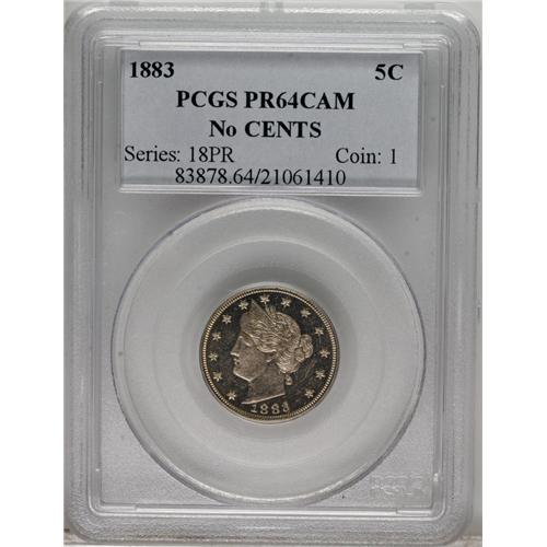 <B>1883 5C No Cents PR64 Cameo PCGS.</B></I> PCGS Population (23/120). NGC Census: (27/101). (#83878)<BR><BR><b>Shipping:</b> Coins & Currency (<a target="_blank" href="http://www.heritageauctions.com/common/shipping.php">view shipping information</a>)