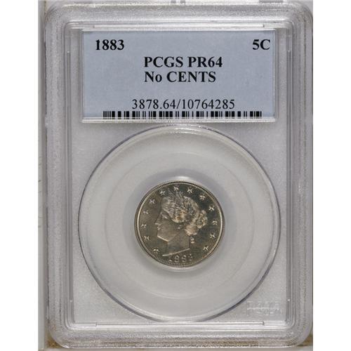 <B>1883 5C No Cents PR64 PCGS.</B></I> Apricot, sky-blue, and champagne-rose hues invigorate this razor-sharp near-Gem. A lovely representative of this scarce single-year proof type.<BR><BR><b>Shipping:</b> Coins & Currency (<a target="_blank" href="http://www.heritageauctions.com/common/shipping.php">view shipping information</a>)