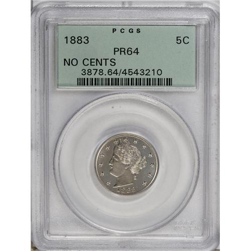 <B>1883 5C No Cents PR64 PCGS.</B></I> Boldly impressed and moderately reflective with a hint of iridescence. This piece would have been a Gem if not for a couple of hairlines in the right obverse field.<BR><BR><b>Shipping:</b> Coin/Currency (<a target="_blank" href="http://www.heritageauctions.com/common/shipping.php">view shipping information</a>)