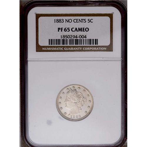 <B>1883<5C> No Cents PR65 Cameo NGC.</B></I> Brilliant throughout with heavily frosted devices that contrast starkly against the deeply mirrored blackness in the fields. An exceptional type coin. Census: 39 in 65 Cameo, 54 finer (5/06).
