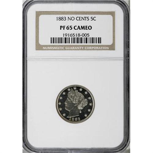 <B>1883 5C No Cents PR65 Cameo NGC.</B></I> A shining Gem with admirable contrast between the subtly toned fields and the boldly struck nickel-gray devices. Excellent visual appeal for this one-year proof subtype.<BR><BR><b>Shipping:</b> Coins & Currency (<a target="_blank" href="http://www.heritageauctions.com/common/shipping.php">view shipping information</a>)
