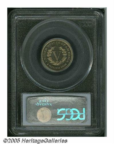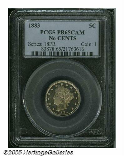 <B>1883<5C> No Cents PR65 Cameo PCGS.</B></I> Fully struck with glittering, lightly toned surfaces that display abundantly deeply mirrored fields and splendidly frosted devices. Other than a couple of tiny nicks, on the reverse, the piece seems essentially pristine.