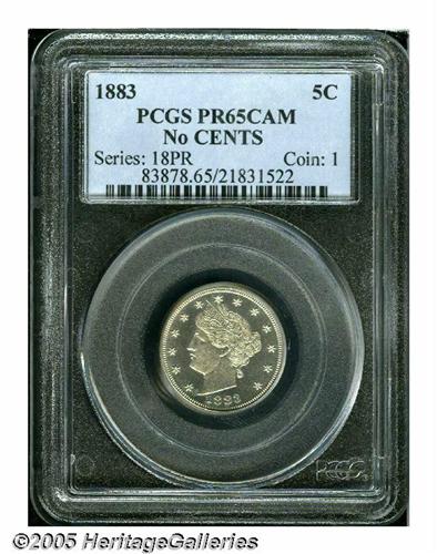 <B>1883<5C> No Cents PR65 Cameo PCGS.</B></I> Mostly brilliant with crisply impressed devices and at least a moderate degree of contrast on either side.