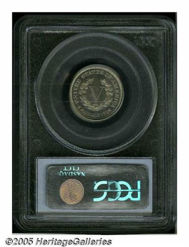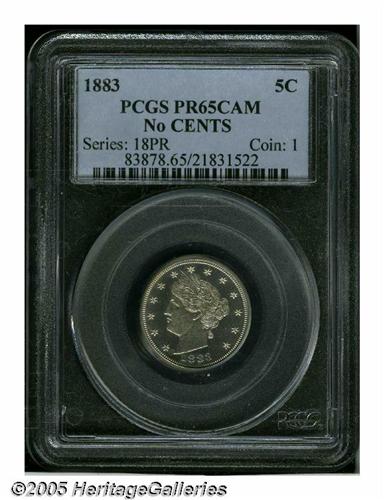 <B>1883<5C> No Cents PR65 Cameo PCGS.</B></I> Watery mirrors and lightly frosted devices produce a moderate amount of attractive contrast. The devices are crisply impressed, and this coin has the Gem eye appeal one would expect.