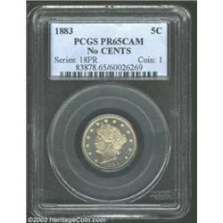 <TABLE cellSpacing=0 cellPadding=0 width="100%" bgColor=#000000 border=0><TBODY><TR><TD width="100%"><TABLE cellSpacing=1 cellPadding=3 width="100%" border=0><TBODY><TR><TD width="100%" bgColor=#79735c><FONT face=arial color=#ffffff size=3><B>Description</B> </FONT></TD></TR><TR><TD width="100%" bgColor=#ffffff><FONT face=arial size=2><B>1883 5C No Cents PR65 Cameo PCGS.</B></I> Pleasingly cameo contrasted with moderate reflectivity and light toning that in no way detracts from the eye appeal of the coin. </FONT></TD></TR></TBODY></TABLE></TD></TR></TBODY></TABLE><BR><A name=PricesRealized></A><TABLE cellSpacing=0 cellPadding=0 width="100%" bgColor=#000000 border=0><TBODY><TR><TD width="100%"><TABLE cellSpacing=1 cellPadding=3 width="100%" border=0><TBODY><TR><TD width="100%" bgColor=#79735c><A name=PR><FONT face=arial color=#ffffff size=3><B>Previous Prices from Heritage Auctions</B> </FONT></A></TD></TR><TR><TD bgColor=#f6f6ed><TABLE cellSpacing=0 cellPadding=0 width="100%" border=1><TBODY><TR><TD align=middle width="33%"><B>Date</B></TD><TD align=middle width="33%"><B>Service</B></TD><TD align=middle width="33%"><B>Price</B></TD></TR><TR bgColor=whitesmoke><TD width="33%"><B>01/13/2003</B></TD><TD width="33%">PCGS</TD><TD width="33%">$805.00</TD></TR><TR bgColor=whitesmoke><TD width="33%"><B>01/11/2003</B></TD><TD width="33%">PCGS</TD><TD width="33%">$747.50</TD></TR><TR bgColor=whitesmoke><TD width="33%"><B>11/23/2002</B></TD><TD width="33%">PCGS</TD><TD width="33%">$891.25</TD></TR><TR bgColor=whitesmoke><TD width="33%"><B>11/23/2002</B></TD><TD width="33%">PCGS</TD><TD width="33%">$1,667.50</TD></TR><TR bgColor=whitesmoke><TD width="33%"><B>09/30/2002</B></TD><TD width="33%">PCGS</TD><TD width="33%">$920.00</TD></TR><TR bgColor=whitesmoke><TD width="33%"><B>09/28/2002</B></TD><TD width="33%">PCGS</TD><TD width="33%">$2,300.00</TD></TR><TR bgColor=whitesmoke><TD width="33%"><B>08/06/2002</B></TD><TD width="33%">PCGS</TD><TD width="33%">$920.00</TD></TR><TR bgColor=whitesmoke><TD width="33%"><B>07/23/2002</B></TD><TD width="33%">PCGS</TD><TD width="33%">$948.75</TD></TR><TR bgColor=whitesmoke><TD width="33%"><B>07/09/2002</B></TD><TD width="33%">PCGS</TD><TD width="33%">$920.00</TD></TR><TR bgColor=whitesmoke><TD width="33%"><B>03/01/2003</B></TD><TD width="33%">NGC</TD><TD width="33%">$471.50</TD></TR><TR bgColor=whitesmoke><TD width="33%"><B>07/29/2003</B></TD><TD width="33%">NGC</TD><TD width="33%">$690.00</TD></TR><TR bgColor=whitesmoke><TD width="33%"><B>03/23/2003</B></TD><TD width="33%">NGC</TD><TD width="33%">$776.25</TD></TR><TR bgColor=whitesmoke><TD width="33%"><B>03/01/2003</B></TD><TD width="33%">PCGS</TD><TD width="33%">$862.50</TD></TR><TR bgColor=whitesmoke><TD width="33%"><B>03/24/2003</B></TD><TD width="33%">PCGS</TD><TD width="33%">$718.75</TD></TR><TR bgColor=whitesmoke><TD width="33%"><B>02/25/2003</B></TD><TD width="33%">PCGS</TD><TD width="33%">$833.75</TD></TR><TR bgColor=whitesmoke><TD width="33%"><B>04/28/2002</B></TD><TD width="33%">NGC</TD><TD width="33%">$1,121.25</TD></TR></TBODY></TABLE></TD></TR><TR><TD bgColor=#ffffff><FONT face=arial size=1 ?>PLEASE NOTE: All prices realized reflect the final hammer price PLUS the buyer's premium in auctions that charge a buyer's premium. Each item has a notation at the top of the listing indicating whether that lot included a buyer's premium. Example: A item that sells with a final hammer price of $100 and a 20% buyer's premium will display with a price realized of $120. All information listed is intended to be as accurate as possible, but errors are possible. Please use this guide carefully and inform us of any inaccuracies. </FONT></TD></TR></TBODY></TABLE></TD></TR></TBODY></TABLE><BR><TABLE cellSpacing=0 cellPadding=0 width="100%" bgColor=#000000 border=0><TBODY><TR><TD width="100%"><TABLE cellSpacing=1 cellPadding=3 width="100%" border=0><TBODY><TR><TD width="100%" bgColor=#79735c colSpan=6><FONT face=arial color=#ffffff size=3><B>Price Guide*</B> </FONT></TD></TR><TR bgColor=#f6f6ed><TD align=middle><B>Grade</B> </TD><TD align=middle><B>Coin World<BR>(Trends)</B> </TD><TD align=middle><B>Numismedia<BR>Retail</B> </TD><TD align=middle><B>Numismedia<BR>Wholesale</B> </TD><TD align=middle><B>Coin<BR>Universe</B> </TD><TD align=middle><B>Heritage<BR>Value Index</B> </TD></TR><TR bgColor=#ffffff><TD align=middle>64</TD><TD align=right>---</TD><TD align=right>---</TD><TD align=right>---</TD><TD align=right>---</TD><TD align=right>$353.50</TD></TR><TR style="FONT-WEIGHT: bold" bgColor=#cccfdd><TD align=middle>65</TD><TD align=right>---</TD><TD align=right>---</TD><TD align=right>---</TD><TD align=right>---</TD><TD align=right>$665.00</TD></TR><TR bgColor=#ffffff><TD align=middle>66</TD><TD align=right>---</TD><TD align=right>---</TD><TD align=right>---</TD><TD align=right>$1,500.00</TD><TD align=right>$1,190.00</TD></TR><TR bgColor=#ffffff><TD colSpan=6><FONT size=1>*All information listed is intended to be as accurate as possible, but errors are possible. No item may be returned or refused based on this information which is provided as a service to our customers. You should contact each pricing source directly to determine the accuracy of this information. </FONT></TD></TR></TBODY></TABLE></TD></TR></TBODY></TABLE><BR><TABLE cellSpacing=0 cellPadding=0 width="100%" bgColor=#000000 border=0><TBODY><TR><TD width="100%"><TABLE cellSpacing=1 cellPadding=3 width="100%" border=0><TBODY><TR><TD width="100%" bgColor=#79735c><FONT face=arial color=#ffffff size=3><B>Population Guide</B> </FONT></TD></TR><TR bgColor=#ffffff><TD align=middle><!-- Begin Output of Population Grid--><TABLE cellSpacing=0 cellPadding=0 width="100%" border=0><TBODY><TR><TD vAlign=center><TABLE cellSpacing=0 width="100%" border=1 cellsadding="3"><TBODY><TR><TD vAlign=center><TABLE cellSpacing=0 cellPadding=3 width="100%" border=1><TBODY><TR><TD vAlign=center align=middle bgColor=#f0f1e8 colSpan=2 <CENTER><FONT face=Arial size=2><B>PCGS Pop </B></FONT>