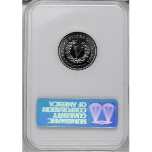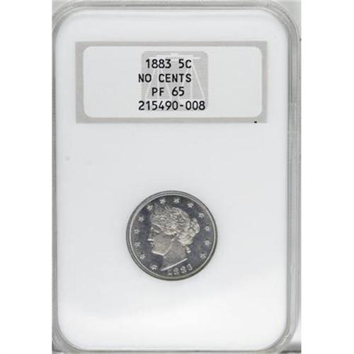 <B>1883 5C No Cents PR65 NGC.</B></I> NGC Census: (244/116). PCGS Population (307/93). Mintage: 5,219. Numismedia Wsl. Price for NGC/PCGS coin in PR65: $850. (#3878)<BR><BR><B>Coin Engraver:</B> Charles E. Barber<BR><BR><b>Shipping:</b> Coins & Currency (<a target="_blank" href="http://www.heritageauctions.com/common/shipping.php">view shipping information</a>)