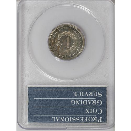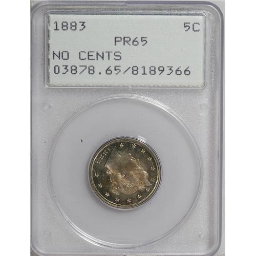 <B>1883<5C> No Cents PR65 PCGS.</B></I> Each side is dove-gray with a different toning accent: the obverse has a rose center, while the reverse has streaks of lavender-violet toning. A nicely mirrored coin housed in a green label holder.