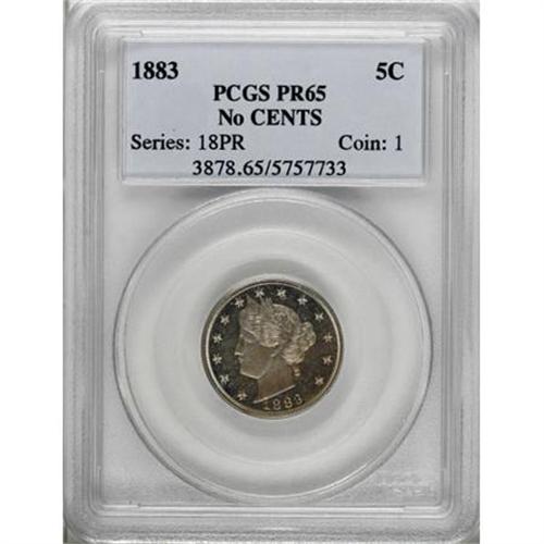 <B>1883 5C No Cents PR65 PCGS.</B></I> A boldly struck example of this one-off proof type, strongly mirrored with excellent eye appeal. Glimmers of nickel-white peek out from beneath the extensive goldenrod toning that drapes each side.<BR><BR><B>Coin Engraver:</B> Charles E. Barber<BR><BR><b>Shipping:</b> Coins & Currency (<a target="_blank" href="http://www.heritageauctions.com/common/shipping.php">view shipping information</a>)