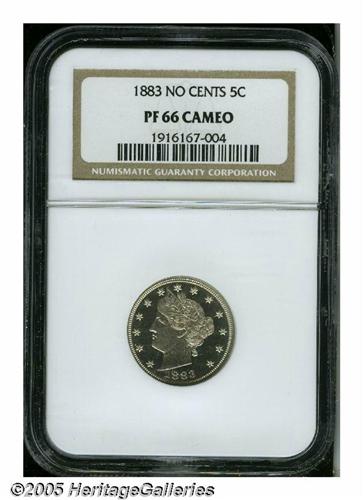 <B>1883<5C> No Cents PR66 Cameo NGC.</B></I> The popularity of the No Cents nickel is enduring and this one-year type in proof format will always be in demand by collectors. This is a nearly brilliant example that displays very deep mirrors in the fields with a moderate amount of mint frost over the devices.