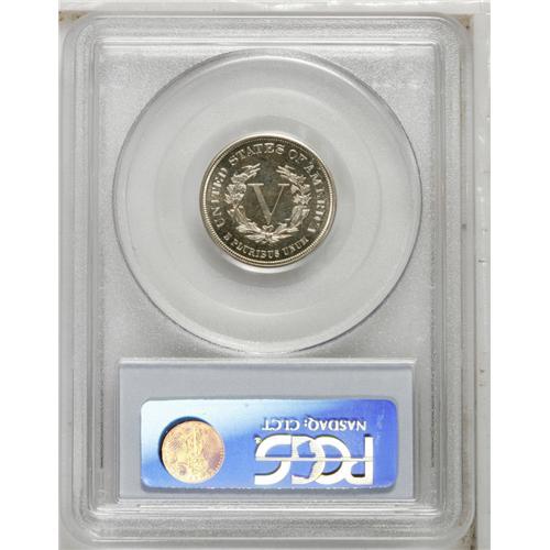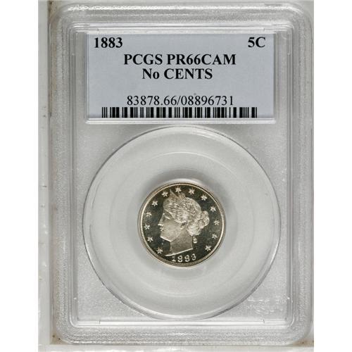 <B>1883<5C> No Cents PR66 Cameo PCGS.</B></I> A deeply mirrored piece with steel-gray patina and excellent contrast. A tiny carbon spot is noted at 12 o'clock on the obverse. Population: 44 in 66 Cameo, 11 finer (7/06).