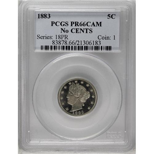 <B>1883<5C> No Cents PR66 Cameo PCGS.</B></I> As seems to be typical of Cameo specimens of this issue, the 1 in the date is clearly repunched. This dazzling, fully brilliant example is certain to please to potential buyer.