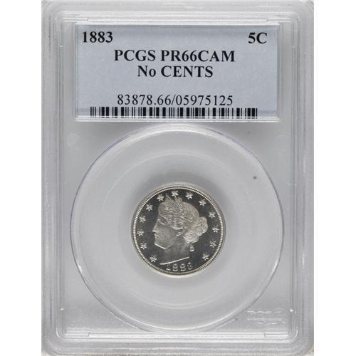 <B>1883 5C No Cents PR66 Cameo PCGS.</B></I> Sharply struck with unusually deep reflectivity in the dark, mirrored fields, and substantial frost on the devices. Free of impairments, with a fresh, spot-free appearance. Population: 48 in 66 Cameo, 11 finer (2/07).<BR><BR><b>Shipping:</b> Coins & Currency (<a target="_blank" href="http://www.heritageauctions.com/common/shipping.php">view shipping information</a>)