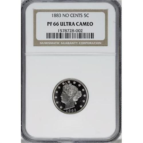<B>1883 5C No Cents PR66 Ultra Cameo NGC.</B></I> The No Cents nickel has an enduring popularity. In part it is from the one-year status of the issue, and in part it is from the chicanery that surrounded the gold plating of these pieces and subsequent creation of "Racketeer Nickels." While common as business strikes, No Cents proofs bear no resemblance in rarity to their business strike counterparts. This is an exceptionally attractive coin that is brilliant throughout. The fields show unfathomable depth of reflectivity and the devices are heavily frosted. Other than a few trivial lint marks, the surfaces are nearly perfect. Census 3 in PR66 Ultra Cameo, 2 finer (10/07).<BR><BR><b>Shipping:</b> Coins & Currency (<a target="_blank" href="http://www.heritageauctions.com/common/shipping.php">view shipping information</a>)