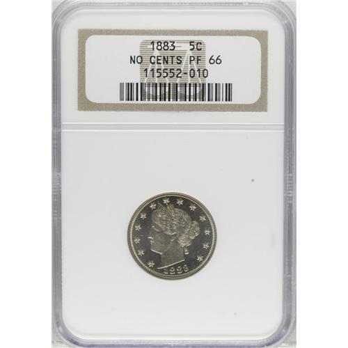 <B>1883 5C No Cents PR66 NGC.</B></I> Delicate apricot-gold patina graces the shimmering surfaces of this crisply struck Premium Gem proof. A delightful example of this always-popular one-year type.<BR><BR><b>Shipping:</b> Coins & Currency (<a target="_blank" href="http://www.heritageauctions.com/common/shipping.php">view shipping information</a>)