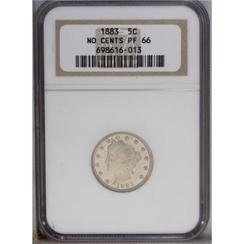 <B>1883 5C No Cents PR66 NGC.</B></I> Lovely lemon-gray patina. Well struck aside from the left ear of corn. An impressively preserved Gem of this popular one-year type. Census: 94 in 66, 18 finer (12/05).